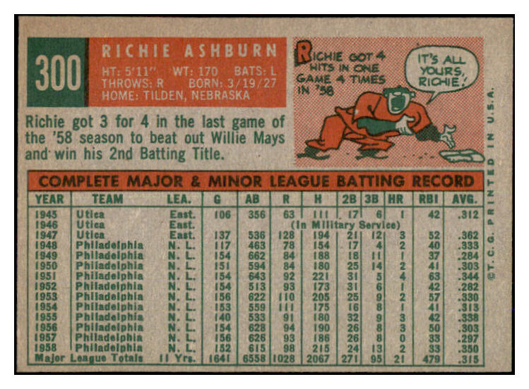1959 Topps Baseball #300 Richie Ashburn Phillies EX 527512