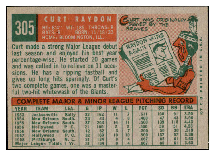 1959 Topps Baseball #305 Curt Raydon Pirates NR-MT 524060