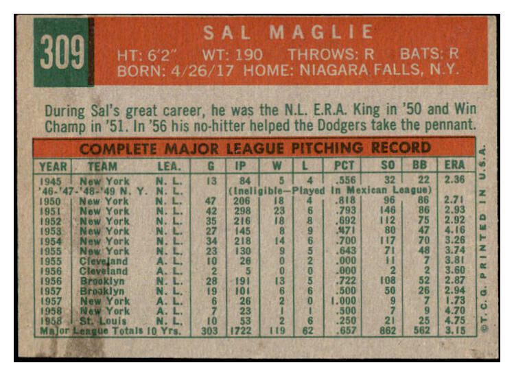 1959 Topps Baseball #309 Sal Maglie Cardinals EX-MT 524312