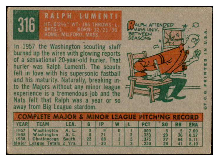 1959 Topps Baseball #316 Ralph Lumenti Senators VG No Trade 534640