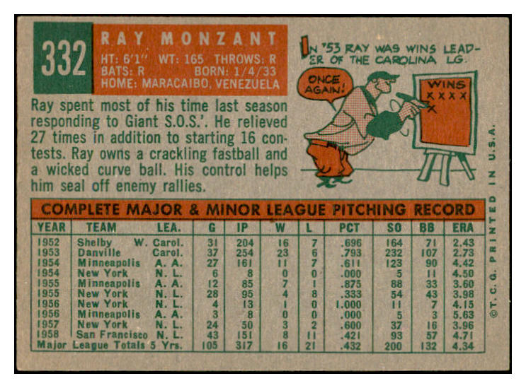 1959 Topps Baseball #332 Ray Monzant Giants EX-MT 536216