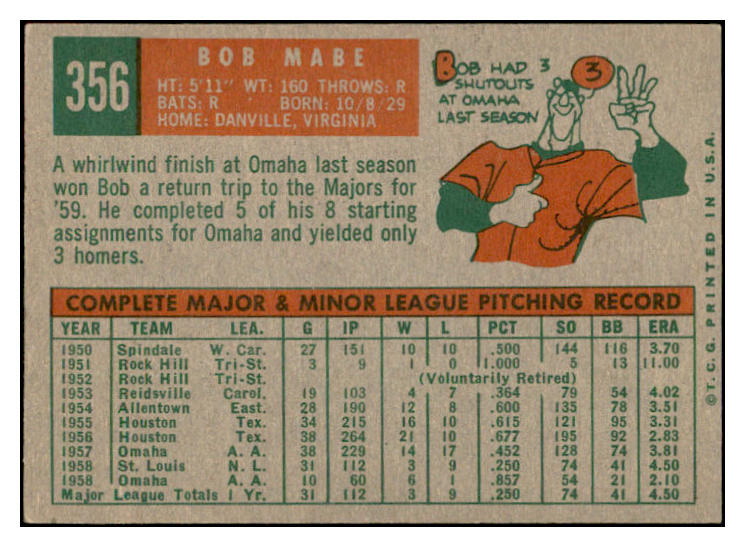 1959 Topps Baseball #356 Bob Mabe Reds EX-MT 536227