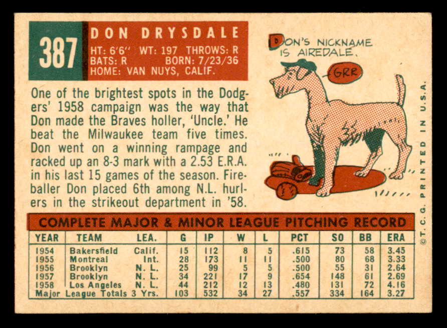 1959 Topps Baseball #387 Don Drysdale Dodgers EX-MT 539224