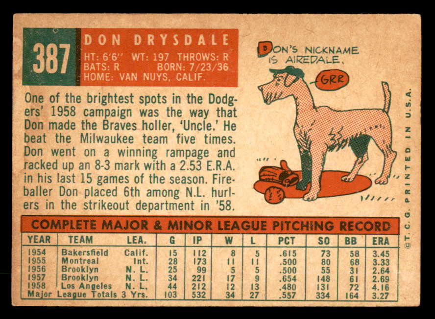 1959 Topps Baseball #387 Don Drysdale Dodgers FR-GD 540188