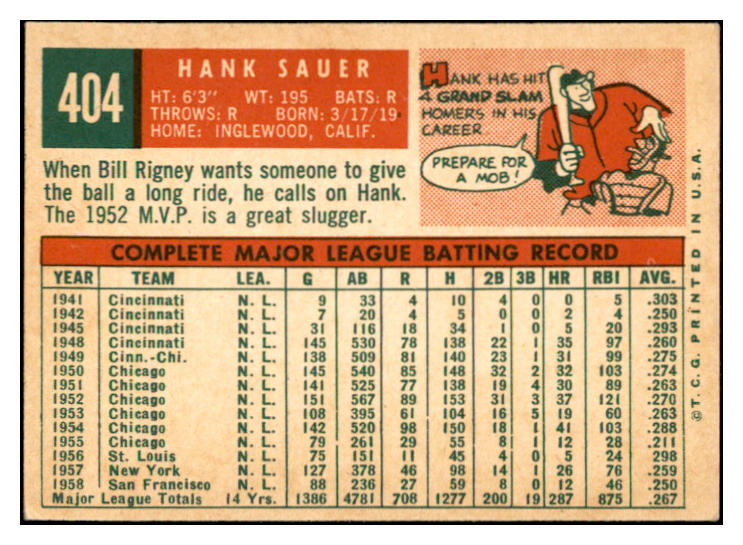 1959 Topps Baseball #404 Hank Sauer Giants EX-MT 536248