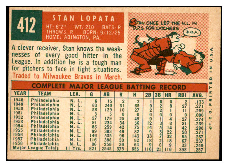 1959 Topps Baseball #412 Stan Lopata Phillies EX-MT 536253