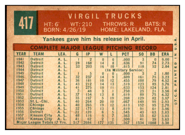1959 Topps Baseball #417 Virgil Trucks Yankees EX-MT 536256