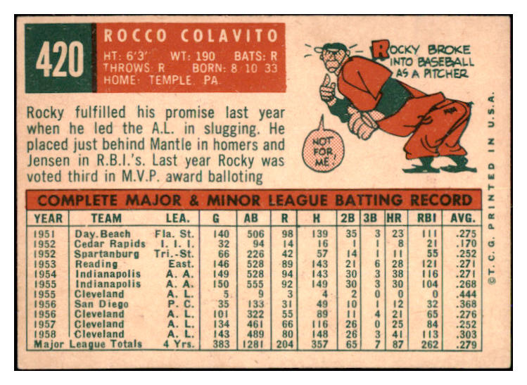 1959 Topps Baseball #420 Rocky Colavito Indians EX 527515