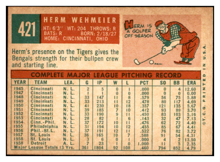 1959 Topps Baseball #421 Herm Wehmeier Tigers EX-MT 536258