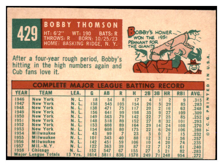 1959 Topps Baseball #429 Bobby Thomson Cubs EX+/EX-MT 527518
