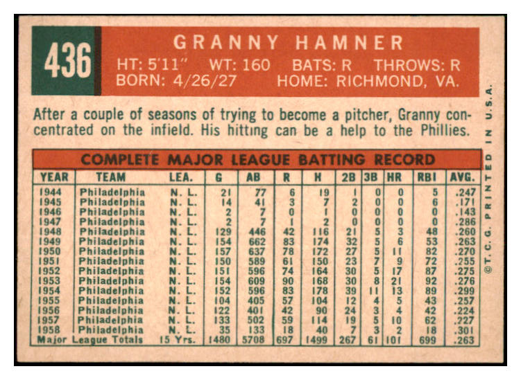 1959 Topps Baseball #436 Granny Hamner Phillies NR-MT 524127