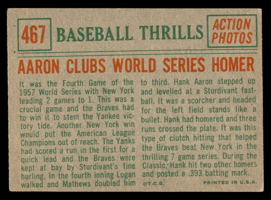 1959 Topps Baseball #467 Hank Aaron IA Braves VG 540195