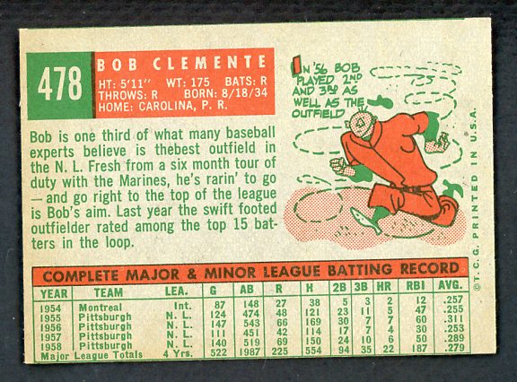 1959 Topps Baseball #478 Roberto Clemente Pirates EX 442029