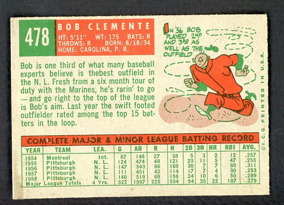 1959 Topps Baseball #478 Roberto Clemente Pirates VG-EX 522331