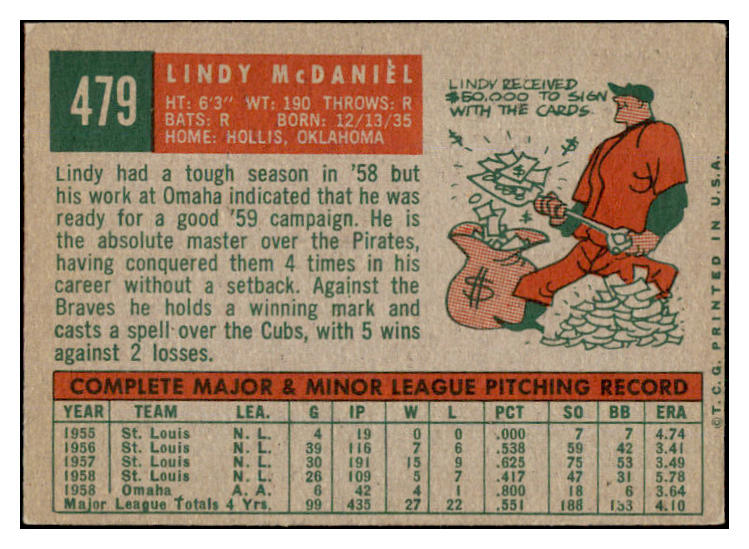 1959 Topps Baseball #479 Lindy McDaniel Cardinals EX-MT 524262