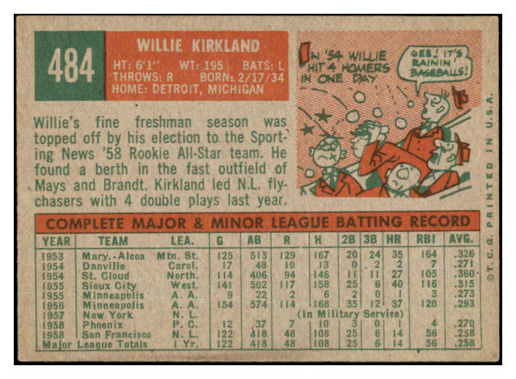 1959 Topps Baseball #484 Willie Kirkland Giants NR-MT 524150
