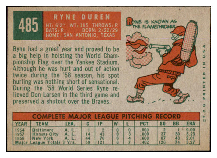 1959 Topps Baseball #485 Ryne Duren Yankees EX-MT 524339