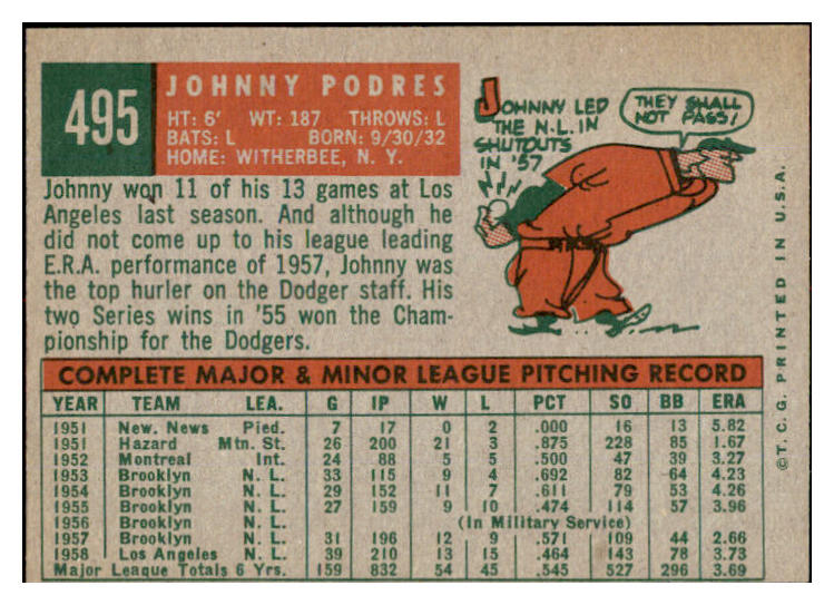 1959 Topps Baseball #495 Johnny Podres Dodgers EX-MT 524341