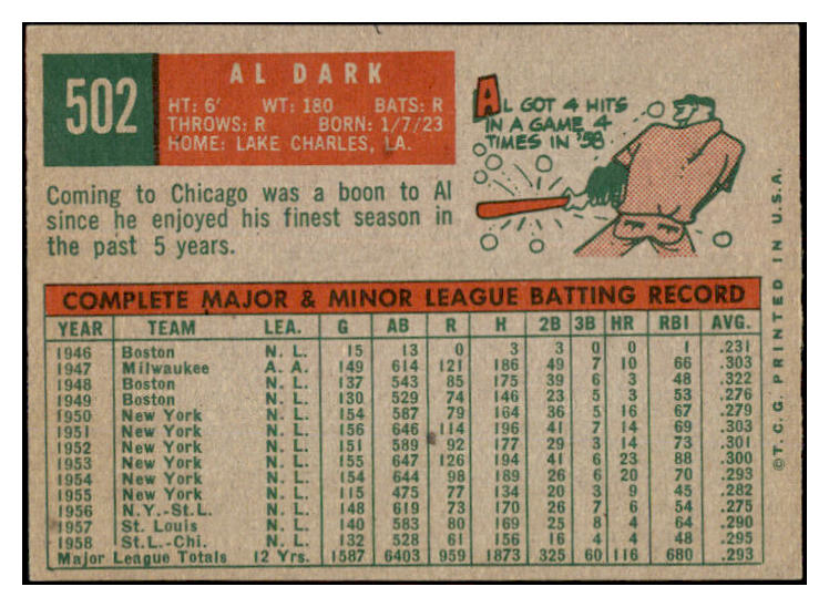 1959 Topps Baseball #502 Al Dark Cubs EX-MT 525378