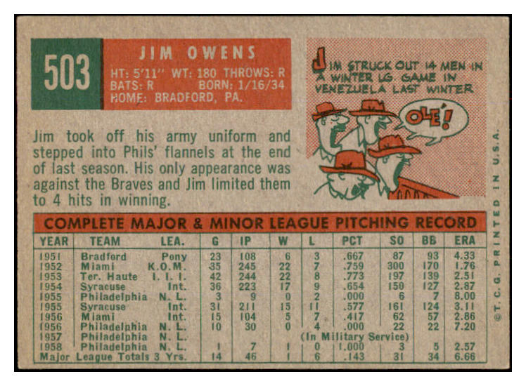 1959 Topps Baseball #503 Jim Owens Phillies EX-MT 524266