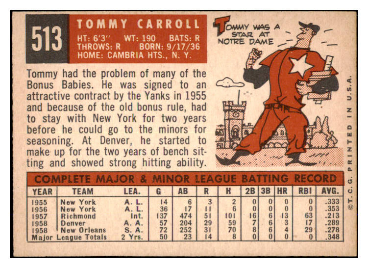 1959 Topps Baseball #513 Tommy Carroll A's EX 527480