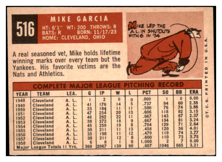 1959 Topps Baseball #516 Mike Garcia Indians EX+/EX-MT 527470