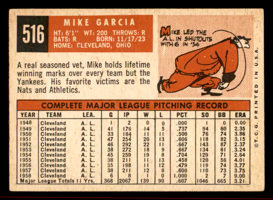 1959 Topps Baseball #516 Mike Garcia Indians VG-EX/EX 542661