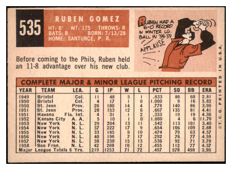 1959 Topps Baseball #535 Ruben Gomez Phillies EX-MT 527482