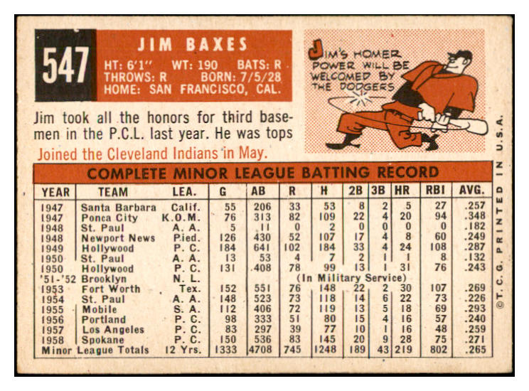 1959 Topps Baseball #547 Jim Baxes Dodgers EX-MT 532412