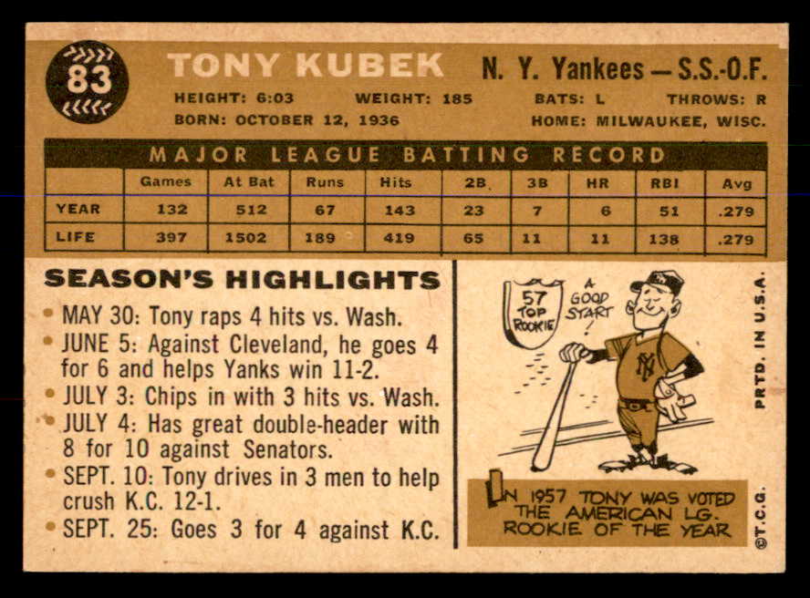 1960 Topps Baseball #083 Tony Kubek Yankees EX-MT 547843