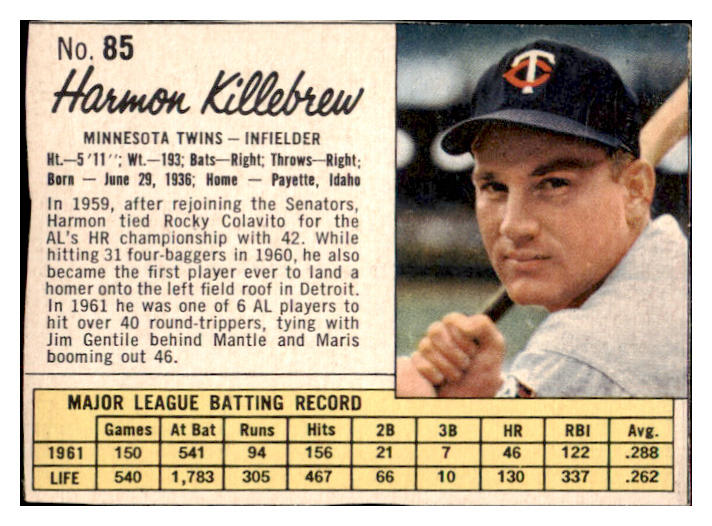 1962 Jello #085 Harmon Killebrew Twins VG-EX 513631