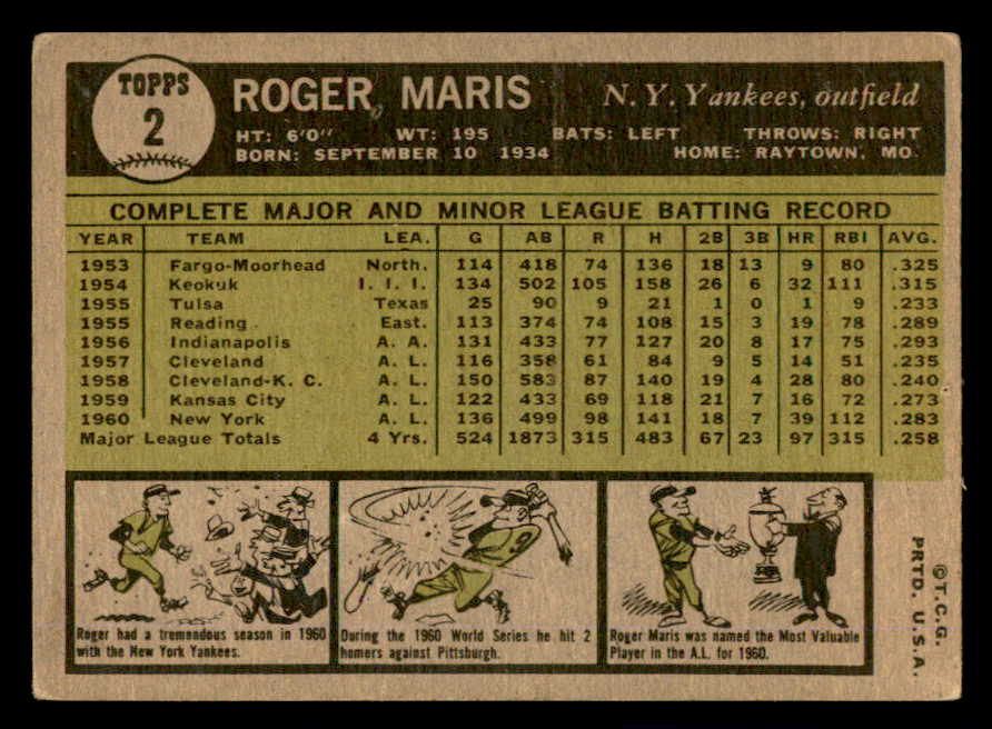 1961 Topps Baseball #002 Roger Maris Yankees VG 540366