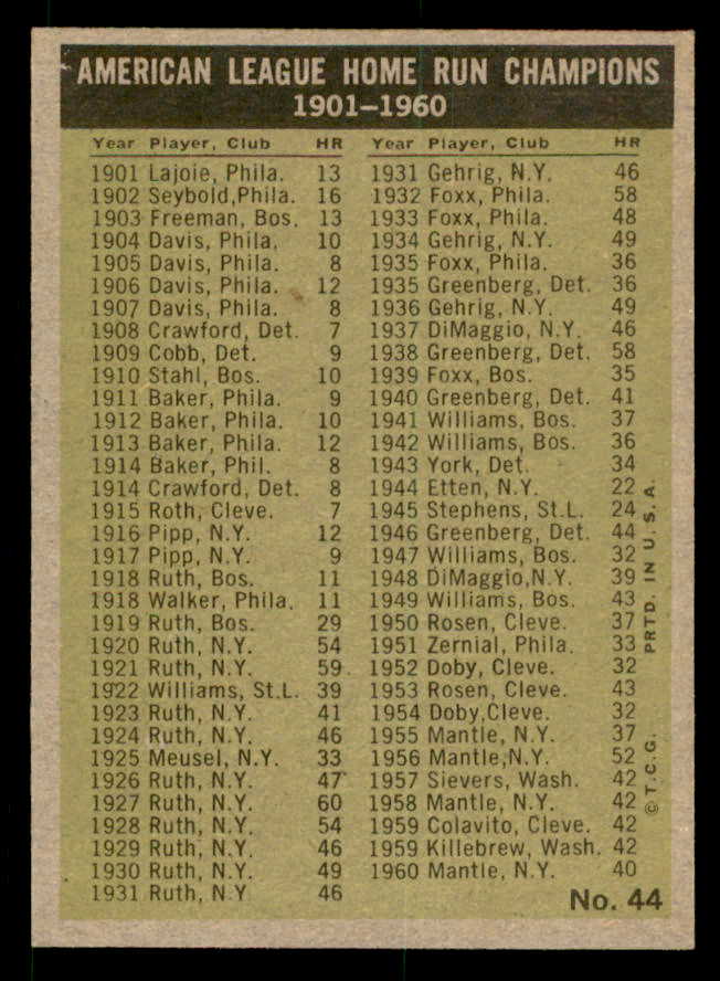 1961 Topps Baseball #044 A.L. Home Run Leaders Mickey Mantle EX-MT 539593