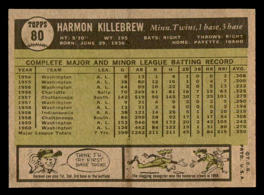 1961 Topps Baseball #080 Harmon Killebrew Twins EX-MT 539386