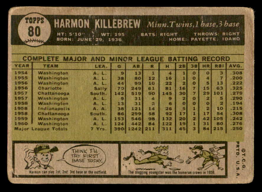 1961 Topps Baseball #080 Harmon Killebrew Twins GD-VG 540272