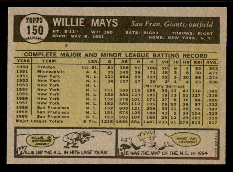 1961 Topps Baseball #150 Willie Mays Giants EX 545734