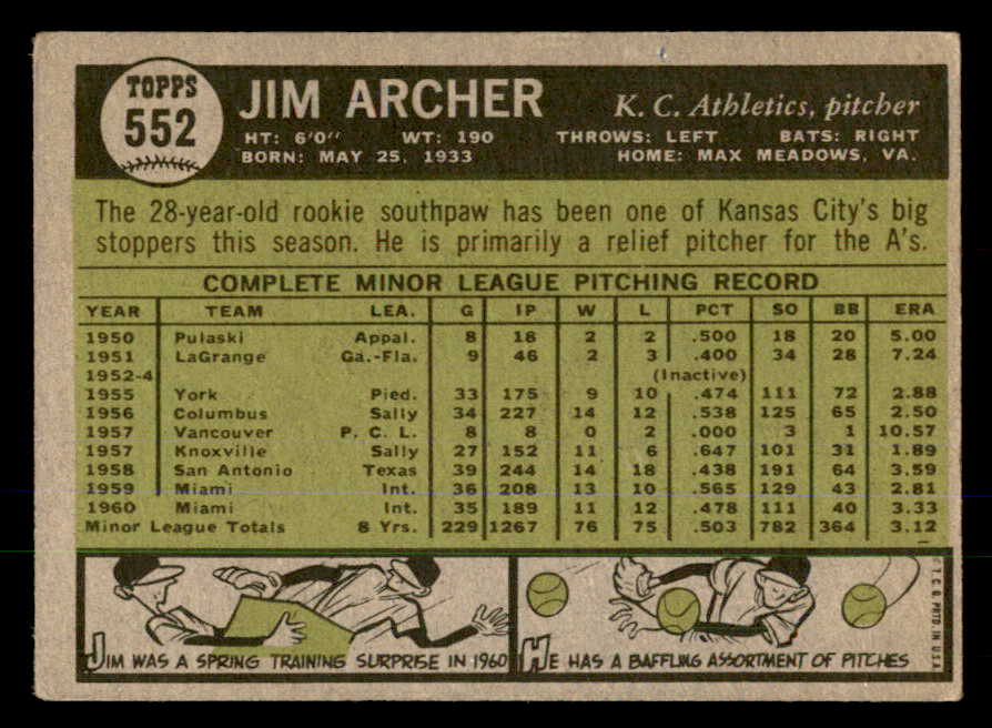 1961 Topps Baseball #552 Jim Archer A's VG 547708