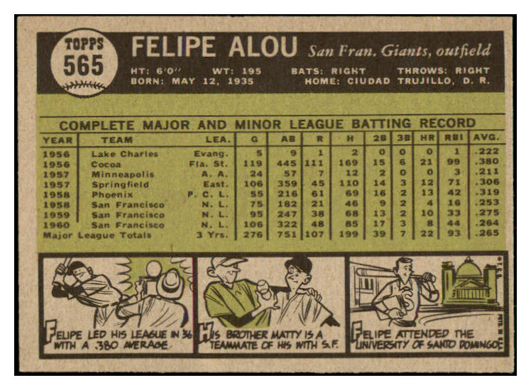 1961 Topps Baseball #565 Felipe Alou Giants EX-MT 531247
