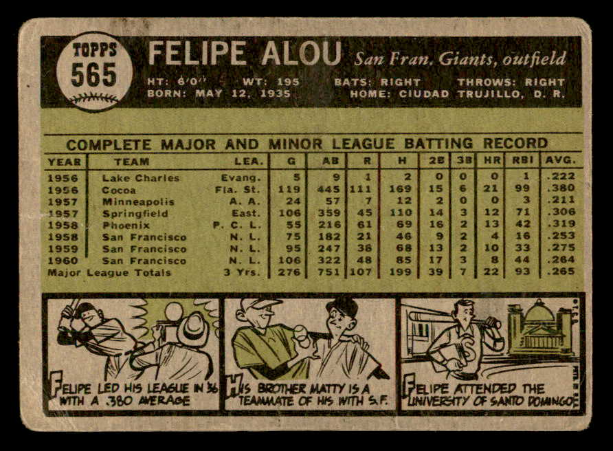 1961 Topps Baseball #565 Felipe Alou Giants FR-GD 540298
