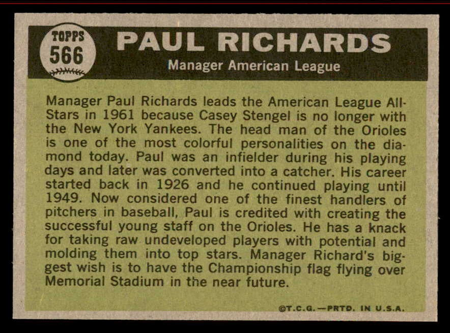 1961 Topps Baseball #566 Paul Richards A.S. Orioles NR-MT 542783