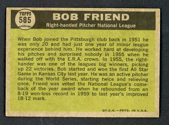1961 Topps Baseball #585 Bob Friend A.S. Pirates VG 540297