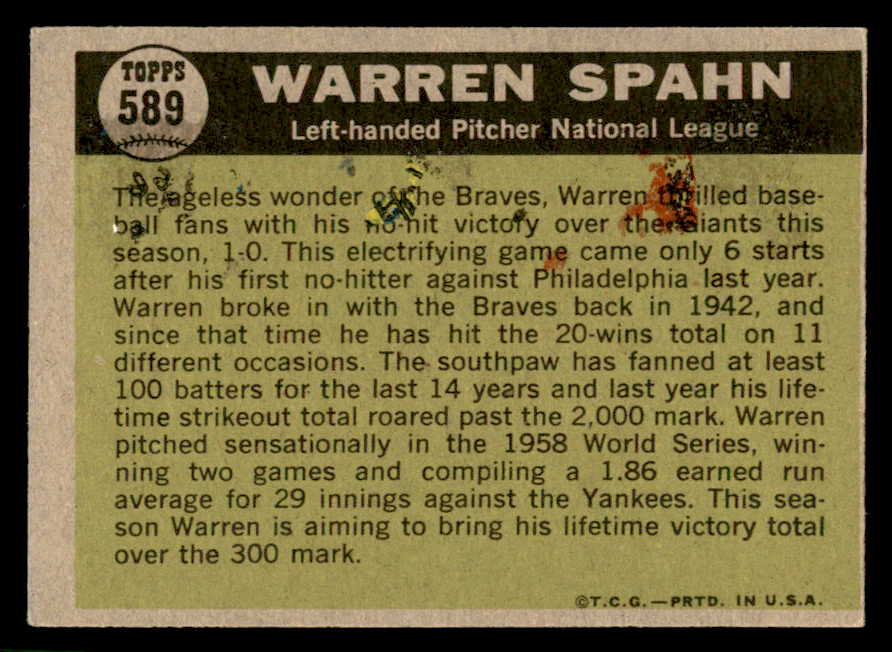 1961 Topps Baseball #589 Warren Spahn A.S. Braves GD-VG 540334