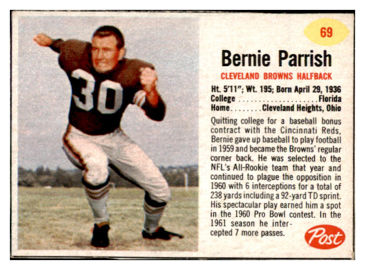 1962 Post Football #069 Bernie Parrish Browns EX-MT 529371