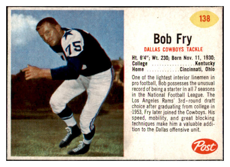 1962 Post Football #138 Bob Fry Cowboys NR-MT 529413