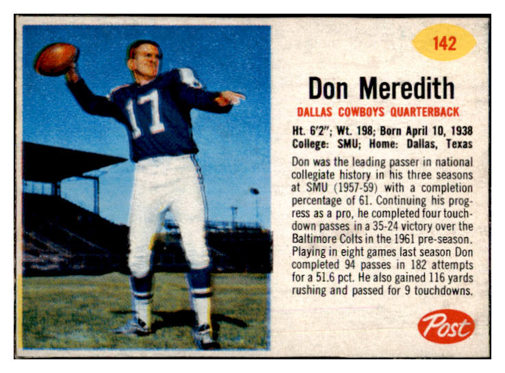 1962 Post Football #142 Don Meredith Cowboys EX-MT 457931