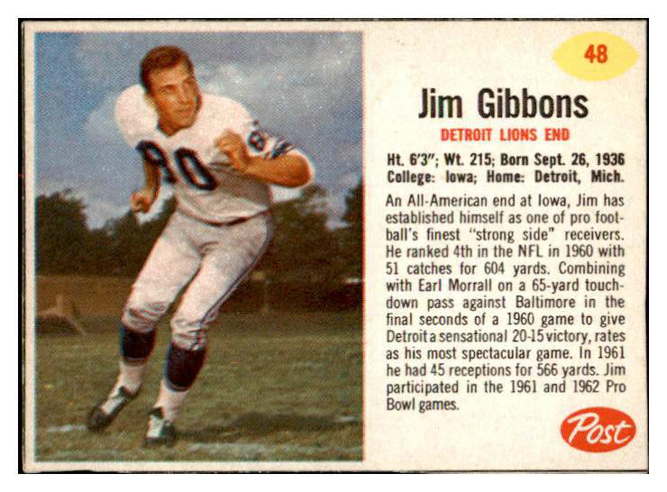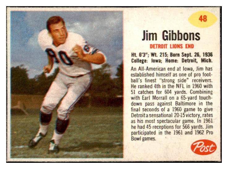 1962 Post Football #048 Jim Gibbons Lions NR-MT 415460