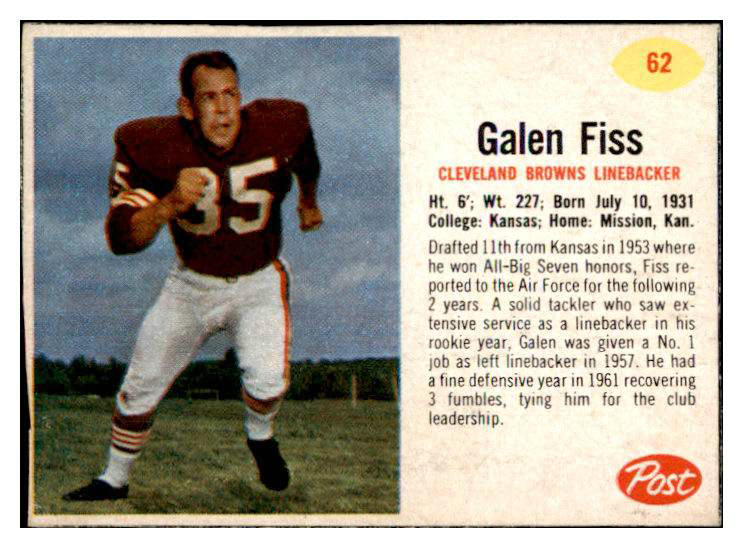 1962 Post Football #062 Galen Fiss Browns EX-MT 415462