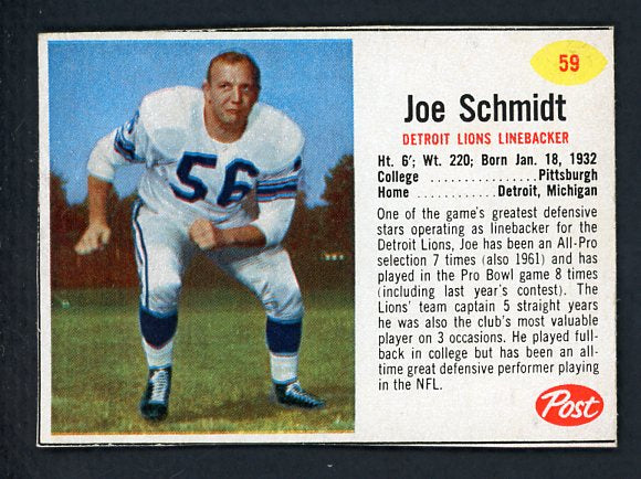 1962 Post Football #059 Joe Schmidt Lions NR-MT 415525