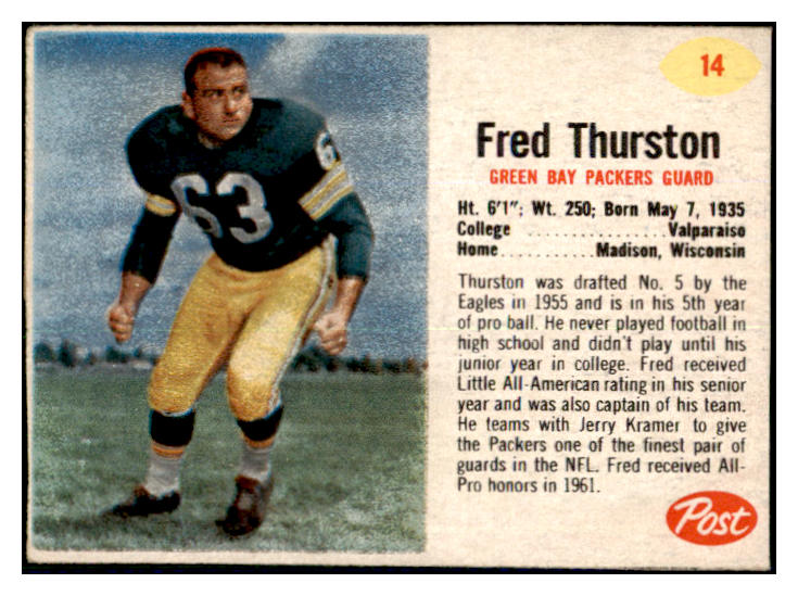 1962 Post Football #014 Fred Thurston Packers EX-MT 436393