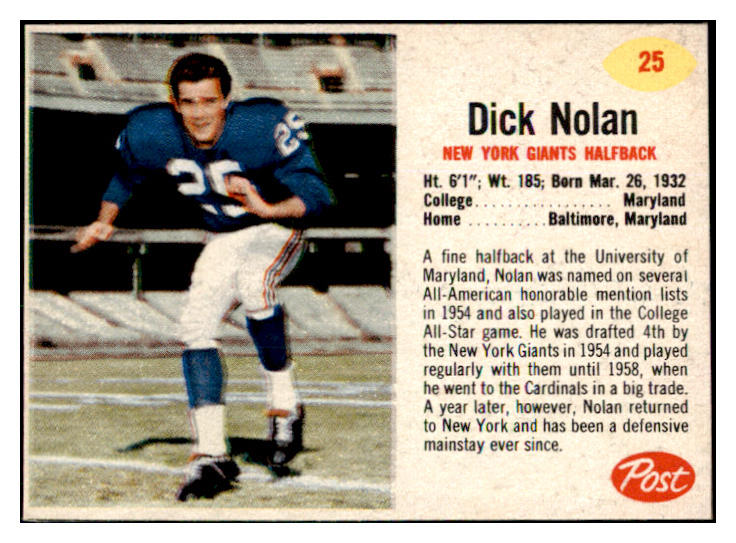 1962 Post Football #025 Dick Nolan Giants NR-MT 436399
